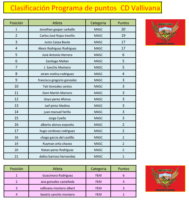 Aquí les facilito la clasificación tras las carreras del fin de semana, de momento hasta el día 13 de Diciembre han debutado 25 corredores del Vallivana, pero Jonathan Gaspar resiste como primero en la clasificación masculina, seguido muy de cerca por carlos, Justo y Alexis, destacar la gran actuación de todos los compañeros en especial de Iseef que se quedo el 21 de la general en Anaga Maratón, gran carrera y espectacular debut.