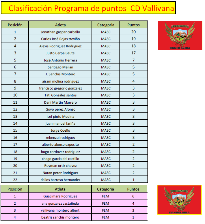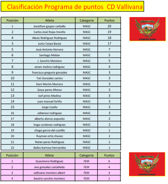 Guacimara se mantiene por cuarta semana consecutiva líder, pero le sigue muy de cerca Ana y Vallivana, si no me he dejado a nadie están todos los que han competido el fin de semana pasado, si alguno no se ve en la lista o no está de acuerdo y ha participado en alguna carrera y no esta publicado que mande clasificación y lo añado. (Les recuerdo tienen que ser ustedes quienes me dejen la información)…