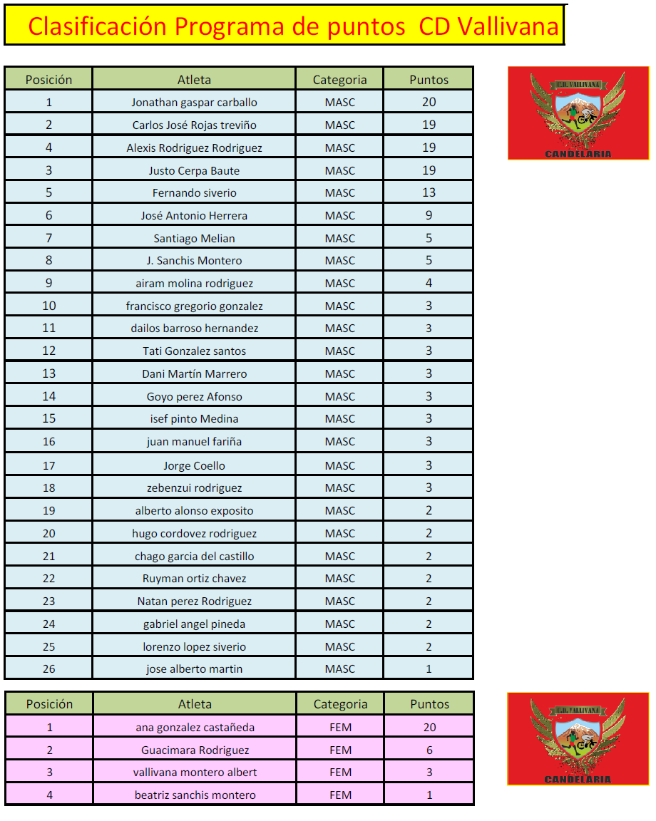 Aquí les facilito la clasificación tras las carreras del fin de semana, de momento hasta el día 27 de Diciembre han debutado 30 corredores del Vallivana, pero Jonathan Gaspar resiste como primero en la clasificación masculina, seguido muy de cerca por carlos, Alexis y justo empatados los tres a los mismos puntos y a tan sólo uno del líder.