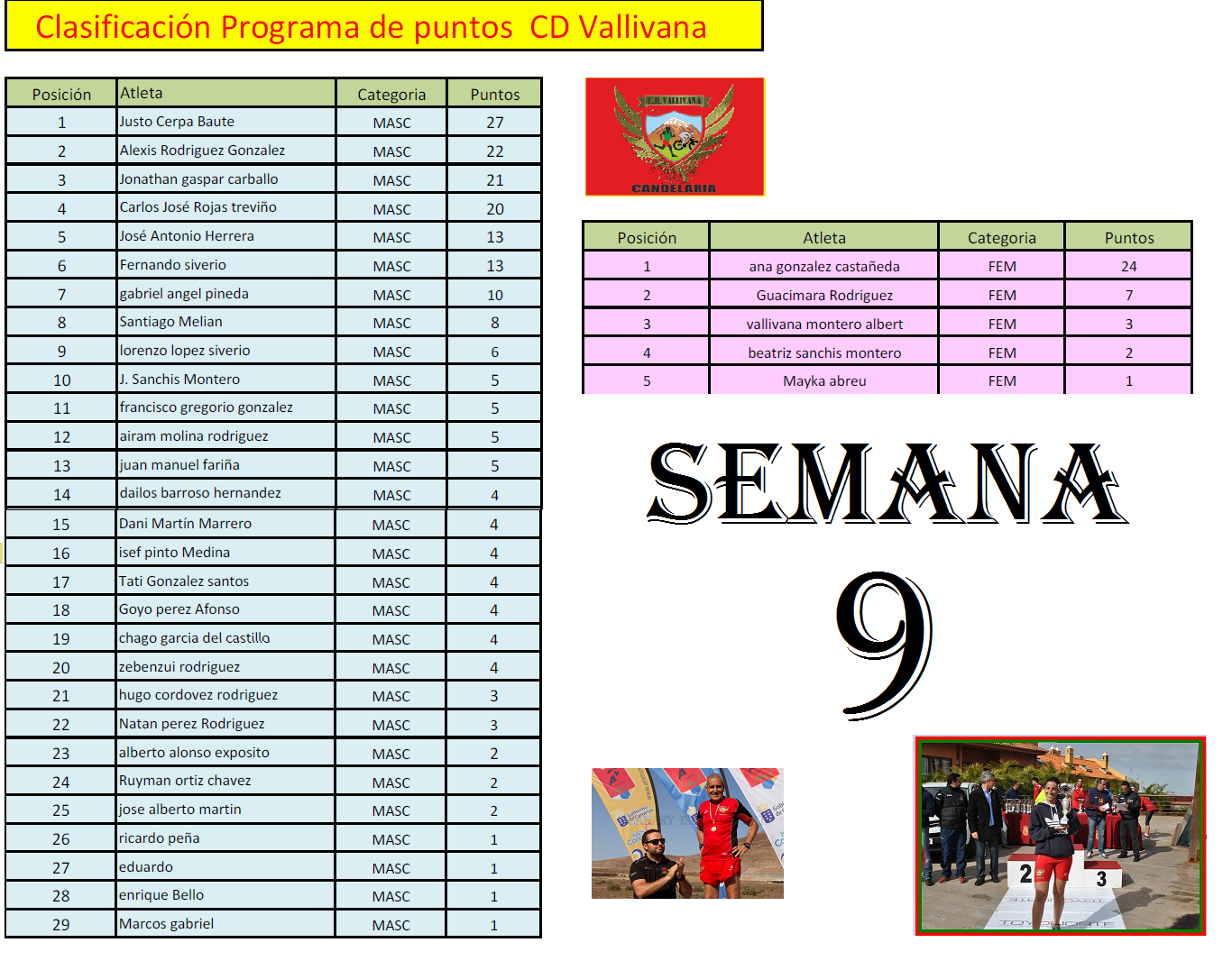 Aquí les facilito la clasificación tras las últimas carreras, (TNT Nocturna de Tegueste, Solidaria en la Palma y Cpto canarias Cross Corto.), esta actualizado hasta el próximo día 24 de enero 2014. A día de hoy han debutado ya 34 corredores del CD Vallivana entre las dos disciplinas (Montaña y atletismo).