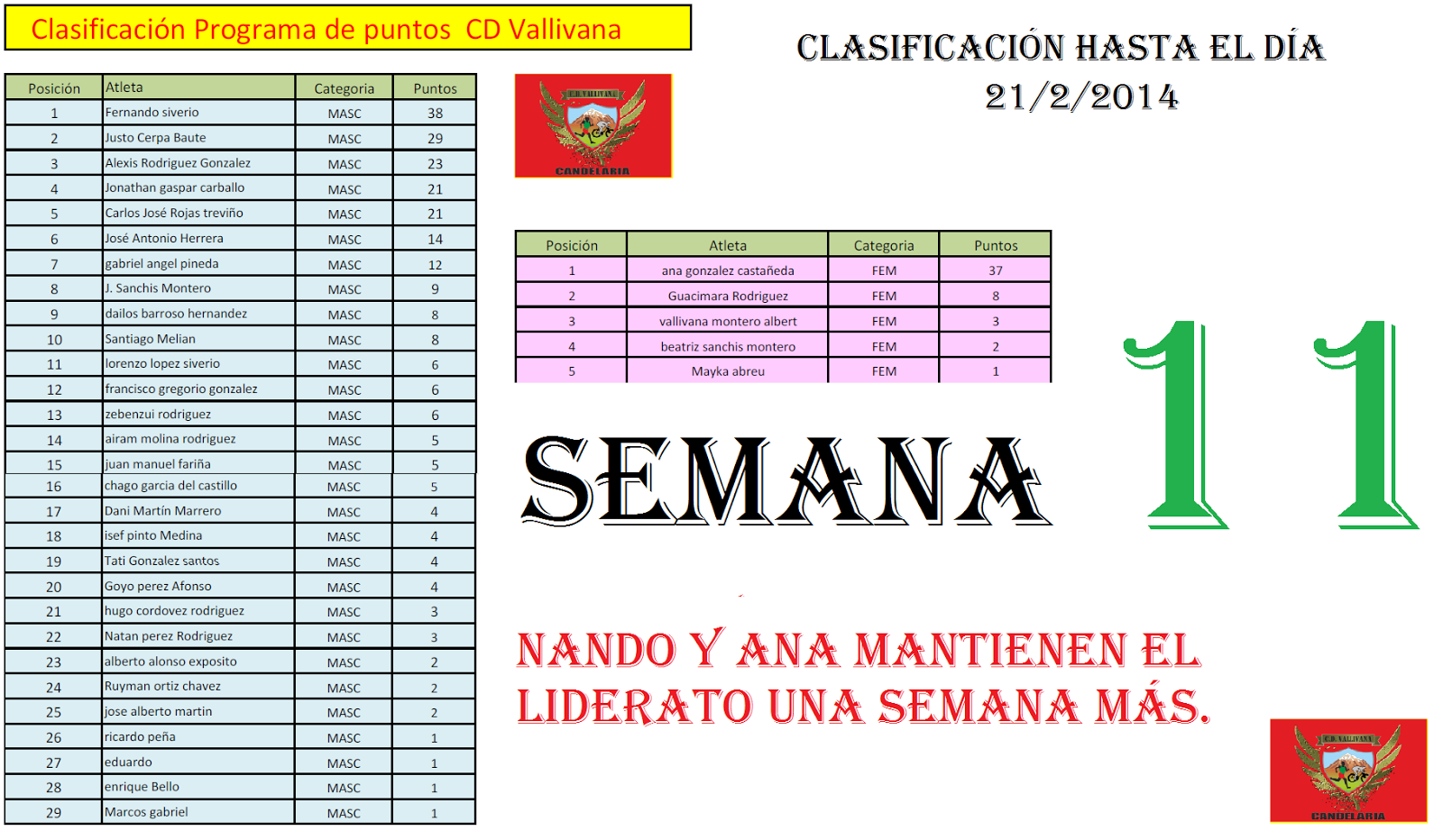 Aquí les facilito la clasificación tras las últimas carreras, (Cpto Canarias Campo a Través 2014 , carrera de la mujer Laguna, y Carrera de la Mujer El Sauzal.), La clasificación esta actualizada hasta el próximo día 21 de Febrero 2014.