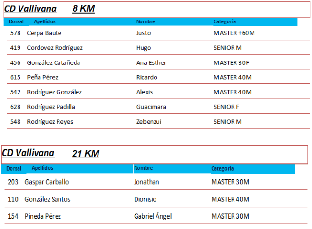 Para finalizar el evento a las 10:30 se dará la salida a la 8k, prueba con gran representación de nuestro club CD Vallivana de Candelaria, (Alexis rodriguez, Zebenzui, Ricardo peña, justo cerpa, Hugo cordovez, Anita piercing, Guacimara Padilla), la prueba cuenta con 241 inscritos ya confirmados.