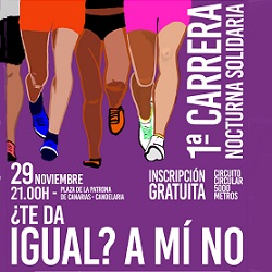 La Concejalía de Igualdaddel Ayuntamiento de Candelaria, con motivo del “Día Internacional de la Eliminación de la Violencia Contra la Mujer”, celebrado el 25 de noviembre, organizó el pasado Viernes la 1º Carrera Nocturna Solidaria, bajo el lema“¿te da igual? A mí no”, con un recorrido aproximado de 5000 metros en el entorno de la Plaza de la Basílica.